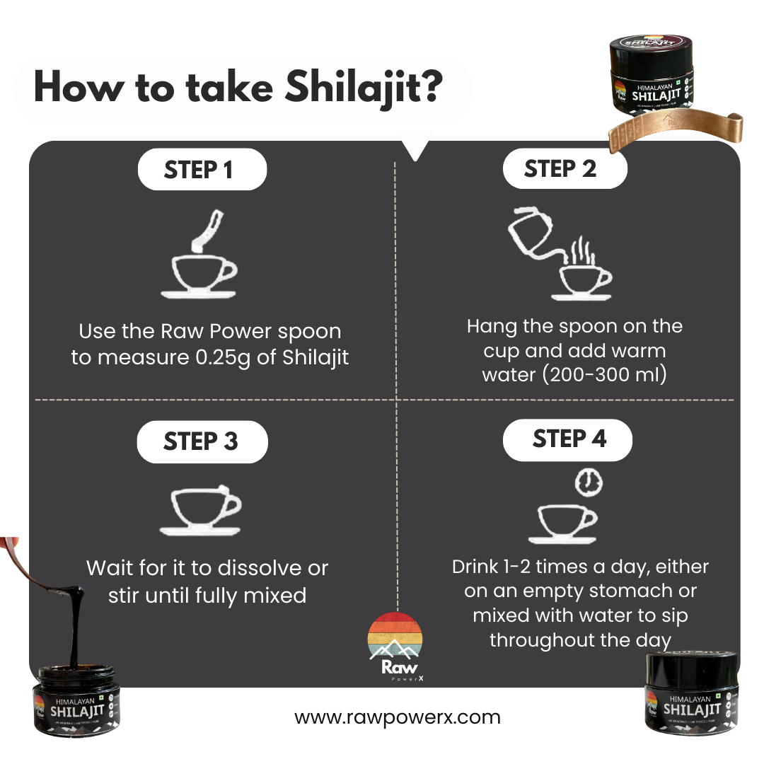Dissolve a pea-sized amount of Shilajit (approximately 300–500 mg) in warm water.
